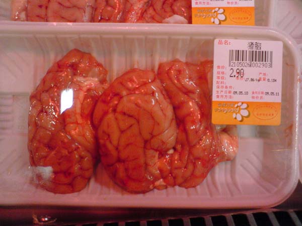 豚インフルエンザが世界的に流行し、とうとう中国まで感染が広がっています。 さて、中国人が「肉」と言えば、豚肉の事です。 中国人は豚肉が大好き。 お部屋の中にはこんなキモカワイイポスターが貼られています。 で、あなたに↓コレが食べられますか? 豚の脳みそです。 スーパーで普通に売られています。もちろん食用なんです。 中国では「薬食同源(医食同源)」と昔から言われてきました。 これの意味は、例えば「目が悪い人は魚の目を食べると良くなる」、「足が悪ければ鶏の足を食べれば歩けるようになる」といった眉唾的民間療法的な思考です。 中国では未だにこれが信じられていて、普通の百貨店などでも不気味な漢方の材料が高価な値段で売られています。 また、中国では古来からそういう意味での補助食品を食べる事が「保健」と考えており、西洋文化が入ってきた際、スポーツに汗を流す西洋人を見て「何の報酬もないのに疲れて馬鹿じゃないか?」と言っていたとか。 話は逸れますが、魯迅はそんな漢方医学に失望して西洋医学を志した そうです。 豚の脳みそであれば、「頭が良くなる」といったところでしょう。 食べれば頭が良くなりますよ?食べますか?おごりますよ!