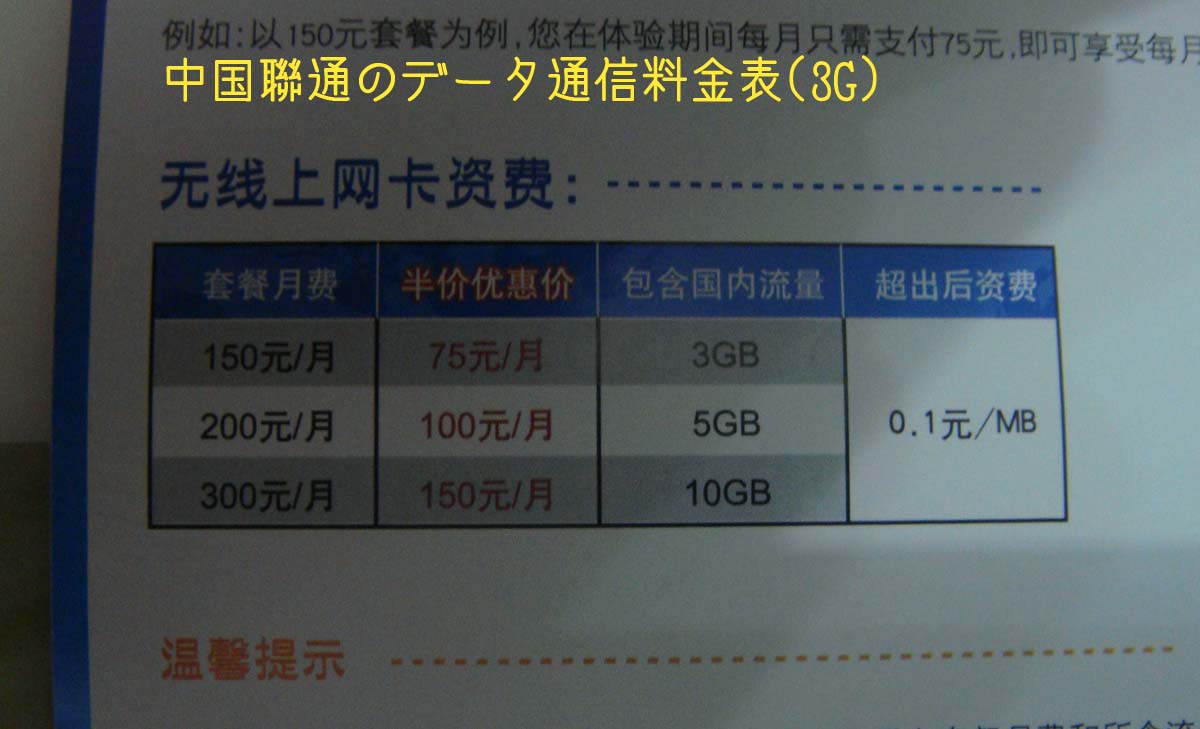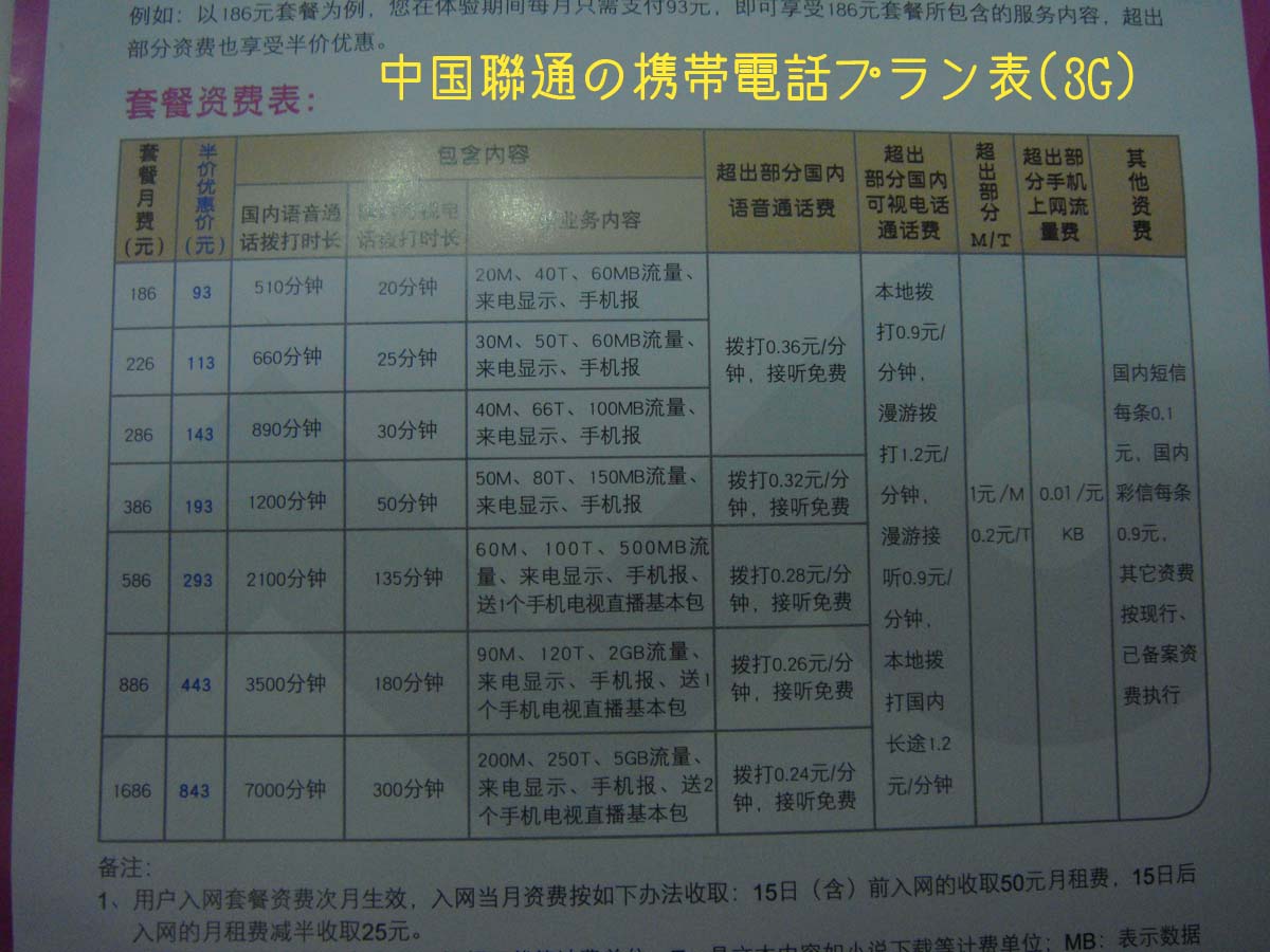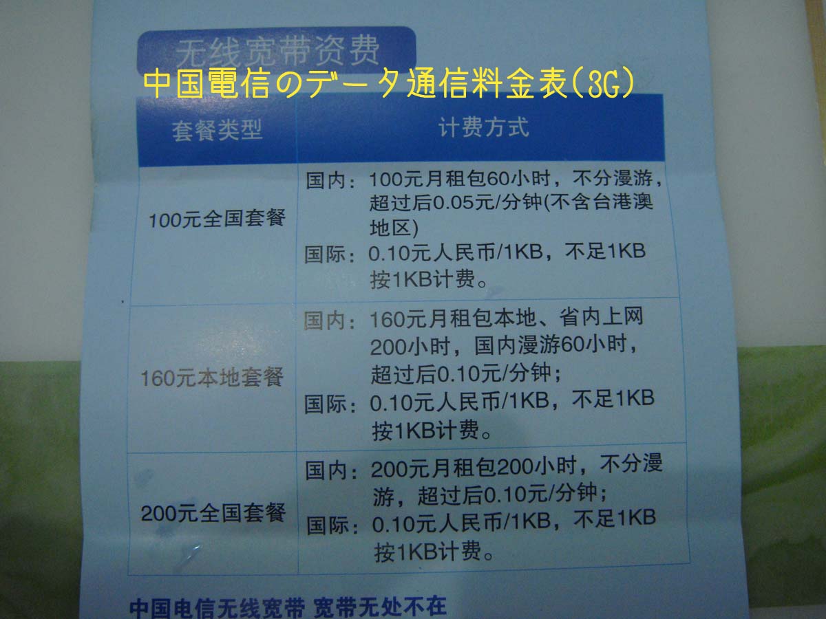 今日たまたま街を歩いていたら、中国聯通(China Unicom) のショップがあったので入ってみました。 いよいよ明日5/17から聯通の3Gサービス が始まります。 とりあえずは全国55都市から。広東は、広州、深せん、東莞、仏山、中山、珠海。 私の住んでいる東莞も対応しているのがうれしいところ。 9月ごろにまたエリアが増えるようです。 明日から受付開始、ということでしたが、店舗内にはすでにパンフレットなどがあり、料金などが確認できました。 携帯のプラン一覧です。もう少し安いのが今後出るとの噂がありますが、今のところ、最安は186元。 国内電話510分の通話と60MBのパケットなどがセットになっています。 表では国内での電話着信が無料となっています。中国移動(2G)だとかなり高いプランのみ国内全土無料なので、もし本当ならいいですね。⇒電話で問い合わせたところ、全国着信無料とのことです! 3Gのエリア外だと2Gでいけるのか?恐らく大丈夫とは思いますが、パンフの中には明記していませんでした。⇒電話で問い合わせたところ、自動的に2Gになるそうです。GSMにも対応している携帯電話なら問題ないでしょう。 また、期間中(5/17-8/31)に申し込むと基本料が半額になるようです。つまり最低93元となります。これはかなり安いですね。 ただ、半額の期間がいつまでなのかは不明です。まさか8/31までということはないと思いますが・・⇒電話で問い合わせたところ、半額は9月末までだそうです。また、キャンペーン期間、つまり試験期間の申し込みは限定だとか。数に限りがあるので、申し込めない可能性があります。正式な受付は9/1からだそうです。 聯通のデータ通信の料金表です。 とりあえず3段階のようですね。データ通信も携帯と同じく、しばらくは半額でいくようです。 最低150元(期間中は75元)で3GBまで。その後は0.1元/MB。毎月最大でも800元分までしか使えないので、後から高額請求が来ることはありません。 ただ現状ですと、3Gのネットワークのみで2Gのネットワークは使えないようです。つまり、全国55都市でしか使えないということ。 これは一時的な処置のようですが、改善してほしいところですね。中国移動は自動切換えのようですから。 また、データ通信は基本的に各社とも国内ローミング(漫遊)は費用に関係ないようです。データ通信用のパソコンに挿すカードの料金 です。 うち600元は通信料のプリペイド分ですので、上記の値段からいくと、数ヶ月くらいは使えるのではないでしょうか。 プランの部分を越えて、一つ上のプランがお得になった場合は自動でプランアップをしてくれるそうです。次の月には元のプランに戻してくれるそうで、至れり尽くせりですね。 ・・さて、次は中国電信です。 さて、中国電信(China Telecom) です。 今までノーマークでした。 何せ今までは固定電話しかやっていなく、エリアなどがどうなのか未知数でした。 実は聯通にたまたま行ったのは電信に用事があったからです。 私の住む街では、電信のすぐ近くに聯通があったのでした。 電信のデータ通信の料金表です。 電信はパケット制ではなく、時間制のようです。 一番安いの100元で月60時間まで。越えた部分は0.05元/分。これは聯通と同じく、国内ローミングは費用に関係ありません。 160元のプランは少し違って、本地(つまりその市・地区)であれば使い放題。 省内は200時間まで。国内は60時間まで。越えた分は0.1元/分。 200元は100元のプランのパワーアップ版ですね。 パケット制にするか時間制にするか選択肢がありますね。電信の160元のプランなら、契約地域であれば使い放題というのは人によっては、魅力的かも知れません。 追記→160元の本地使い放題・・というのは私の勘違いでした。読み間違いました。 要するに、契約の市・地区を含め、省内で200時間まで、ということのようです。 すみませんでした。 時間制の良し悪しはともかく、エリアが広いのと、3Gエリア外でも2Gで通信できるようで、今のところ個人的には、データ通信なら中国電信がいいかな、と思っています。 なお、通信用のカードも売られており、およそ400元でした。 料金は先に300元程度を先払いするようです。 上にも書きましたが、電信はエリアがよく分かりません。 店員に「エリアはどうなっているか?」と聞いたのですが、「全国で使える」としか言わず「じゃあチベットの山奥でも使えるのか?」と問いただすと、かなり困惑していました。勉強不足ですね! 日本のようにエリアの範囲を示した全国地図とかないんでしょうか?中国ではどのキャリアでも未だ見たことが一度もないです。 <追記> 中国のポータルサイト「新浪」でも3Gの特集 が組まれていました。 この情報によると、聨通の3G開通の55都市とは以下のようです。 北京、上海、广州、深圳、东莞、佛山、珠海、中山、长沙、合肥、福州、厦门、泉州、兰州、海口、三亚、天津、长春、哈尔滨、沈阳、大连、昆明、金华、杭州、宁波、温州、台州、拉萨、呼和浩特